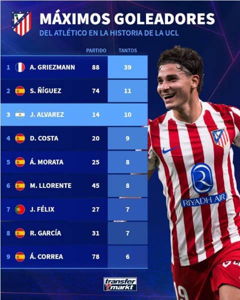 根據(jù)統(tǒng)計(jì), 阿爾瓦雷斯已經(jīng)代表馬競(jìng)在歐冠中打進(jìn)了10粒進(jìn)球,位列隊(duì)史歐冠進(jìn)球榜第三名。